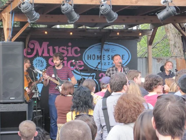 Eventually I wanted to, you know, hear some music, so I took a walk across the Congress Avenue bridge to see the WOXY.com day party at Home Slice Pizza. (Unfortunately, the day parties at SXSW were WOXY's swan song, as they were forced to cease operations the following week, but let's not dwell on that.) I caught the very last song of The Lonely Forest's set. It was "We Sing in Time," of course, which the band probably played a dozen times in the span of 3 or 4 days at SXSW. That's the thing -- it's not uncommon to have a band play a dozen or more SXSW gigs official and unofficial. I probably missed a Lonely Forest gig at my mom's house.